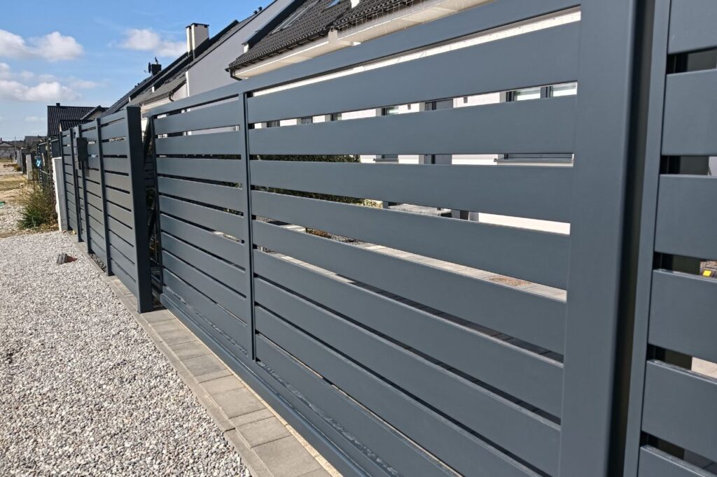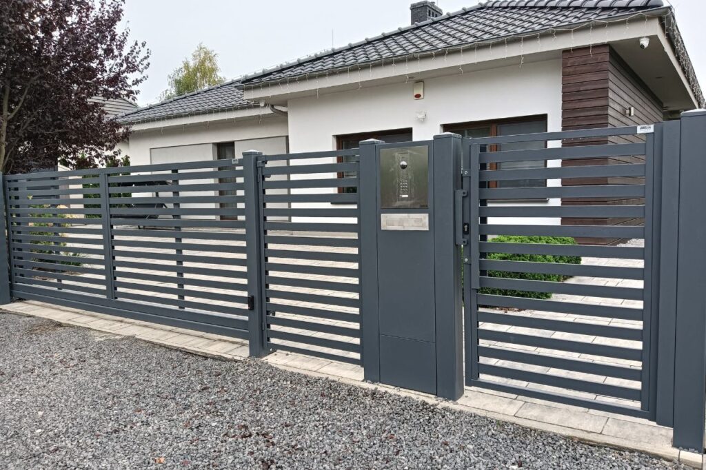 Zastosowane poziome profile nadają całości nowoczesny charakter, a dopasowanie wszystkich elementów – od przęsła po bramę – tworzy estetyczną i funkcjonalną całość.