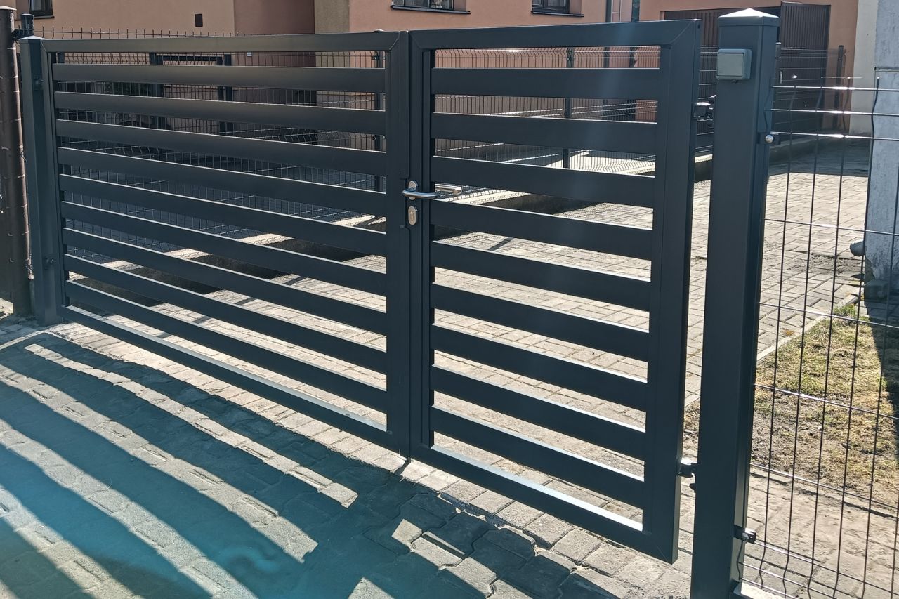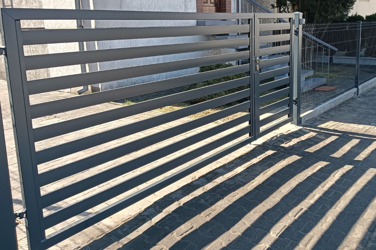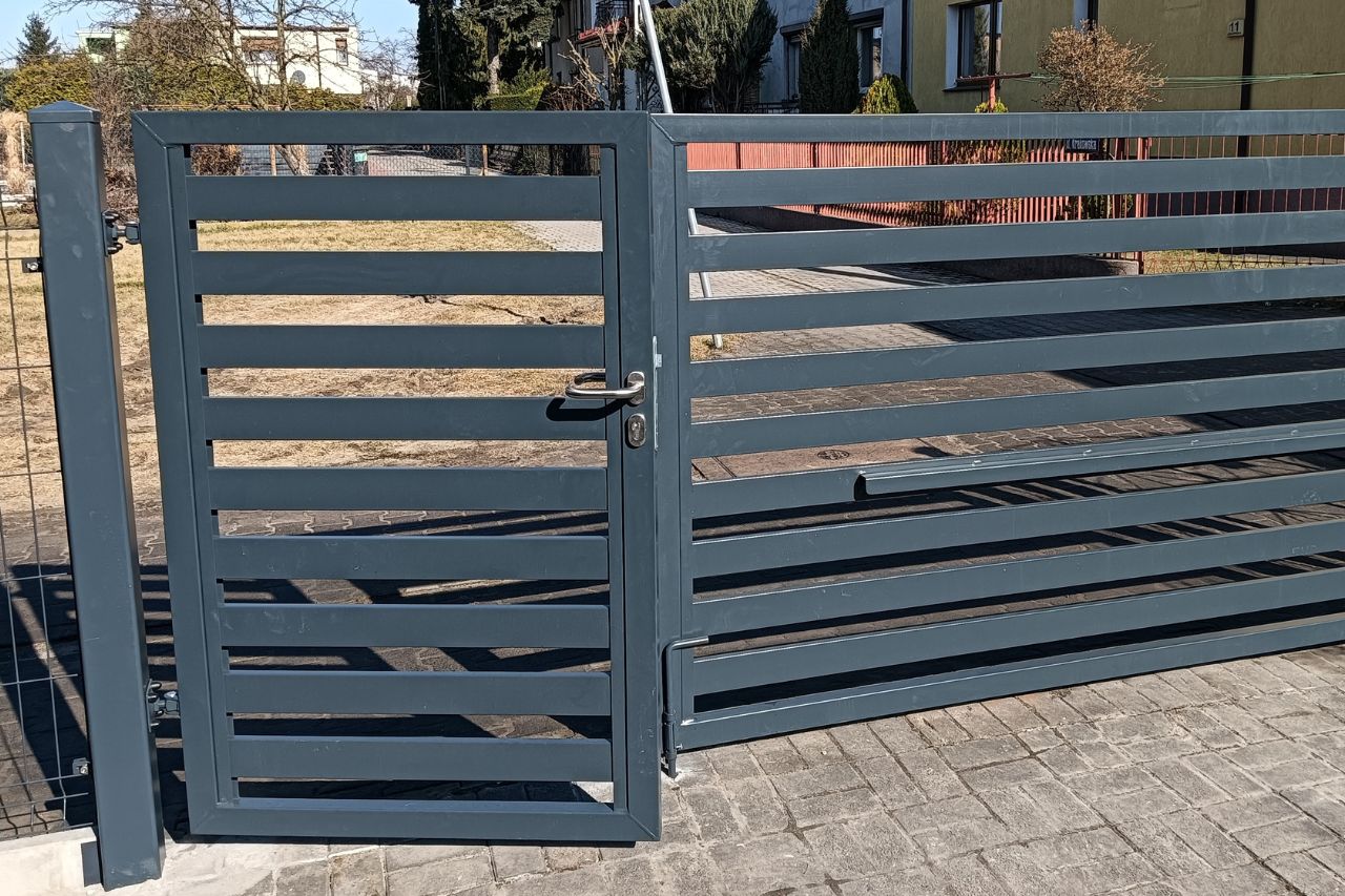Do bramy dwuskrzydłowej można dopasować furtkę wykonaną w tym samym wzorze i kolorze, dzięki czemu wszystkie elementy ogrodzenia tworzą jednolitą i estetyczną całość.